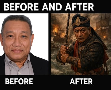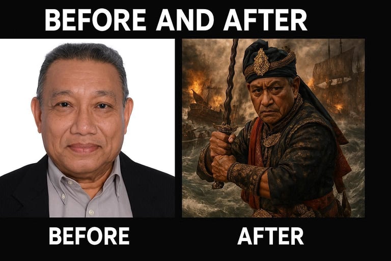 Kami transformasikan imej anda menjadi watak berani seperti pahlawan laksamana, orang kaya atau pemimpin yang kuat.